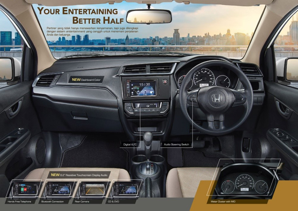 New Honda Mobilio grade S (M/T) hadir dengan beberapa fitur seperti New Stylish Front Grille Design, New 15" Alloy Wheel, New 2DIN Audio with Bluetooth & Hands Free Telephone.