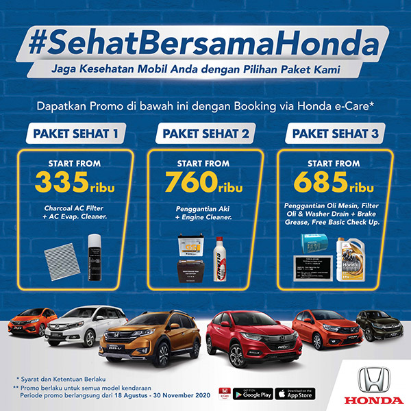 Melengkapi berbagai program yang sedang berjalan saat ini, Honda mengusung program "Sehat Bersama Honda", yaitu promo bagi konsumen untuk mendapatkan paket harga perawatan mobil terbaik. Dalam program ini, konsumen dapat memilih beberapa paket yang disediakan yang diantaranya adalah Paket Sehat 1 dimana konsumen akan mendapatkan AC filter beserta dengan AC evaporator cleaner dengan harga mulai dari Rp335.000. Untuk Paket Sehat 2, konsumen akan mendapatkan penggantian aki beserta pembersih mesin dari harga Rp760.000. Untuk Paket Sehat 3, konsumen akan mendapatkan penggantian oli, filter oli, washer drain beserta Brake Grease dan gratis perawatan berkala dimulai dari Rp. 685.000. Program ini berlangsung hingga 30 November 2020 bagi konsumen yang telah melakukan booking service pada aplikasi E-care yang dapat diunduh di Playstore.